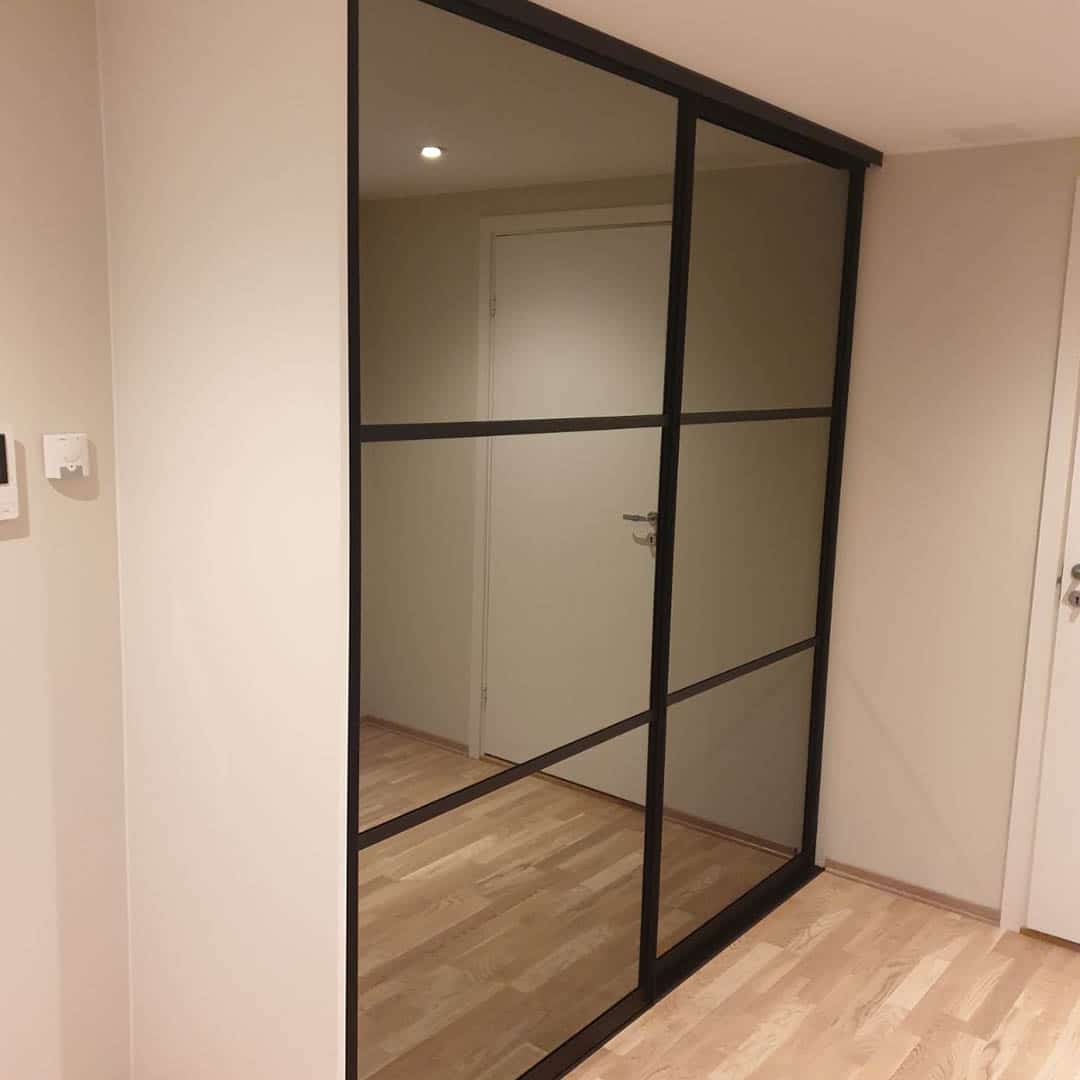 Skyvedørsgarderobe til gang, med skyvedørsfronter med speil og glass, og skreddersydd innredning. Samt skyvedører til garderobe på barnerom.